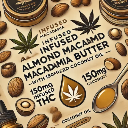 Infused Almond MacadamiIndulge in the creamy, luxurious blend of our Infused Almond Macadamia Butter, crafted with premium roasted almonds and rich macadamia nuts, enhanced with 150mg of pure THC coconut oil. This nutrient-packed butter provides a smooth, earthy flavor, enriched with a unique infusion that supports relaxation, mood enhancement, and overall wellness.a Butter with 150mg THC Coconut Oil
